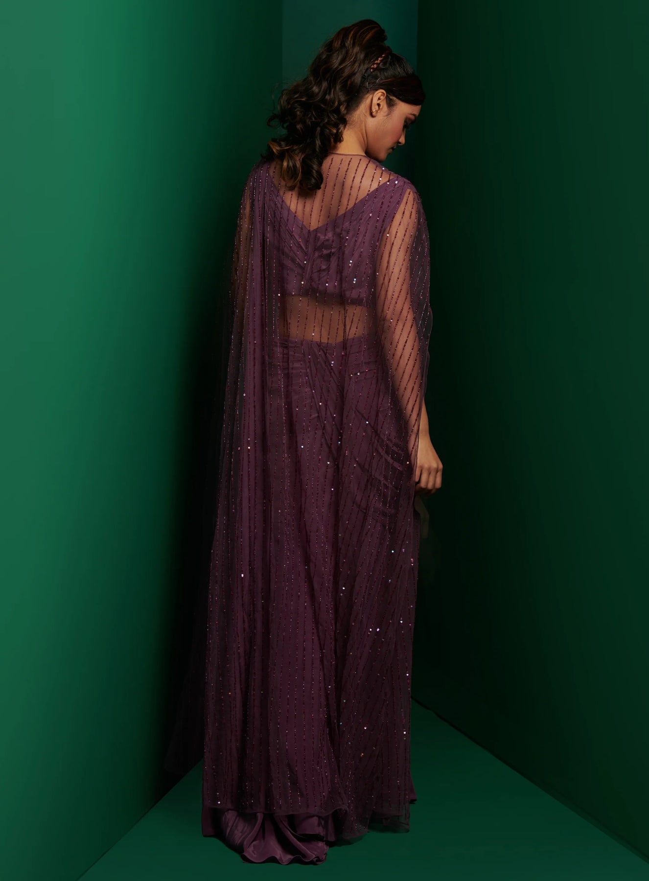 Midnight Purple Pleated Corset Top With Drape Skirt and Embellished Cape
