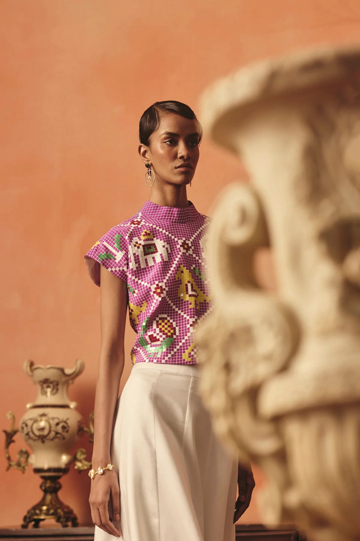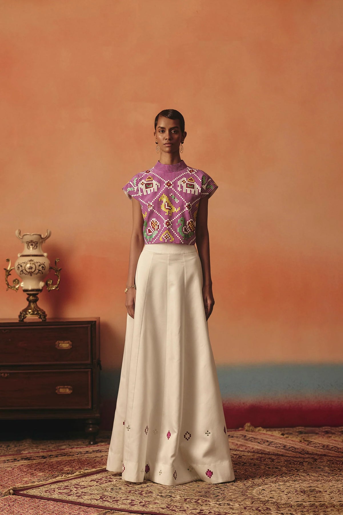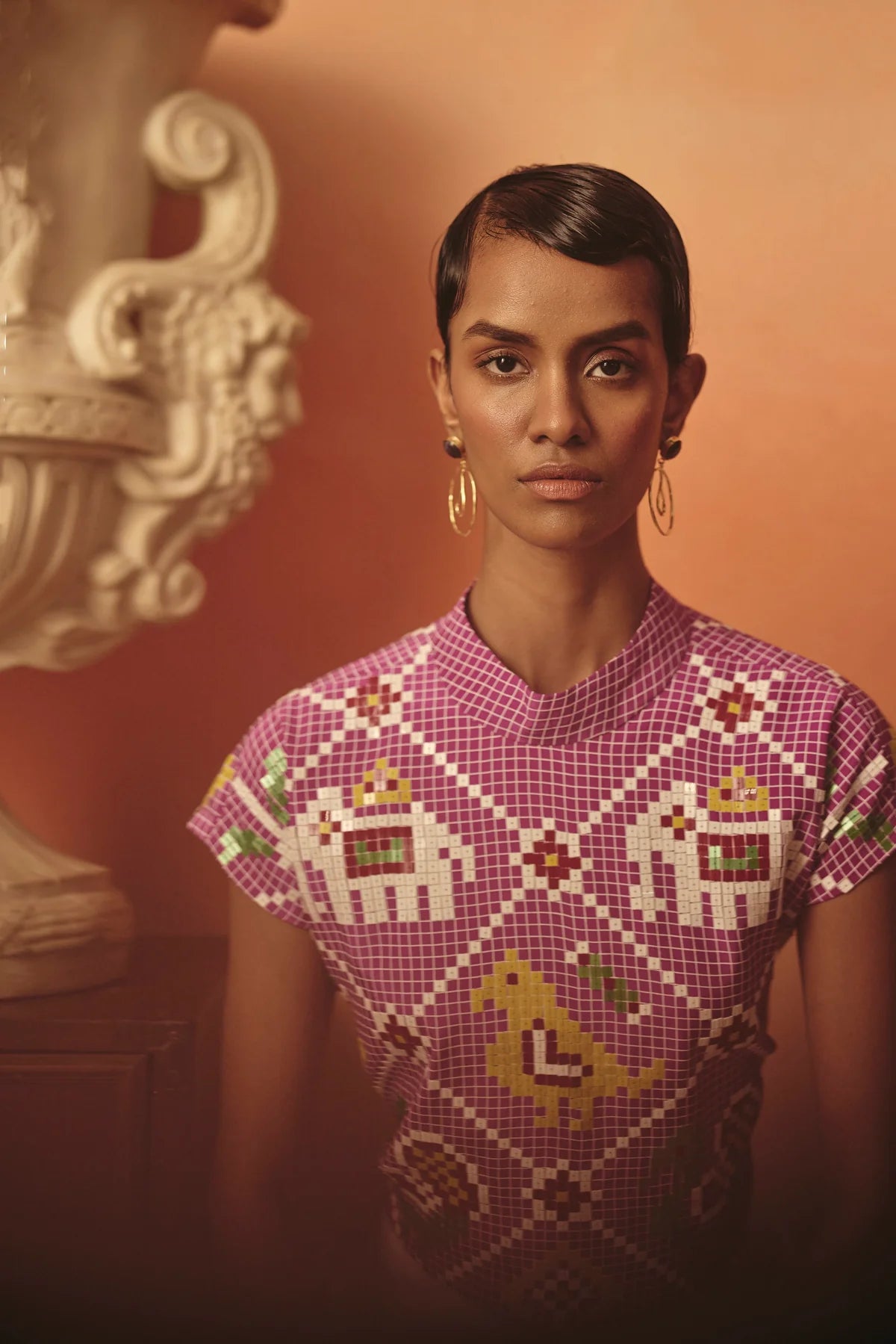 Embroidery/print: Ikat-inspired pattern and our signature sequins detailing on the top
