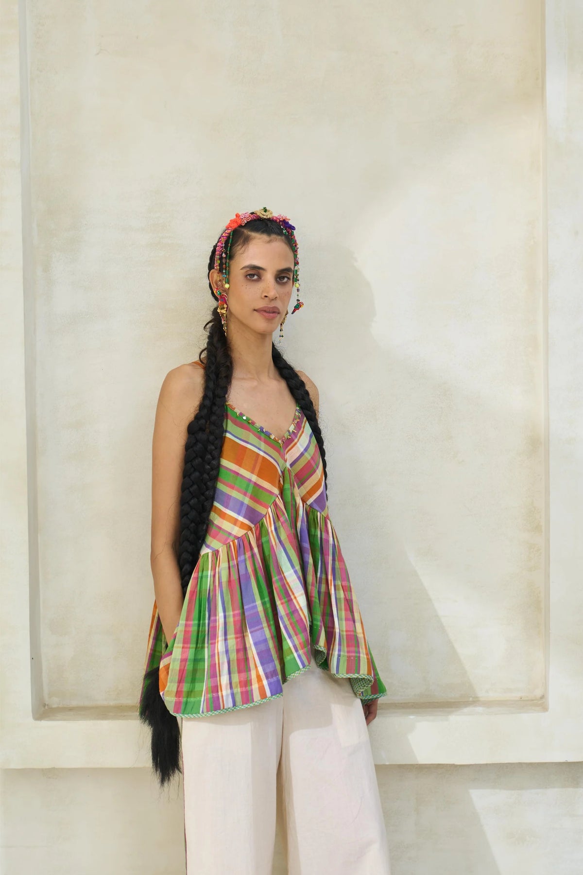 Handwoven, yarn-dyed Bengal 100% cotton irregular Playful Pop Multi check with 100% cotton Spring Green very small check