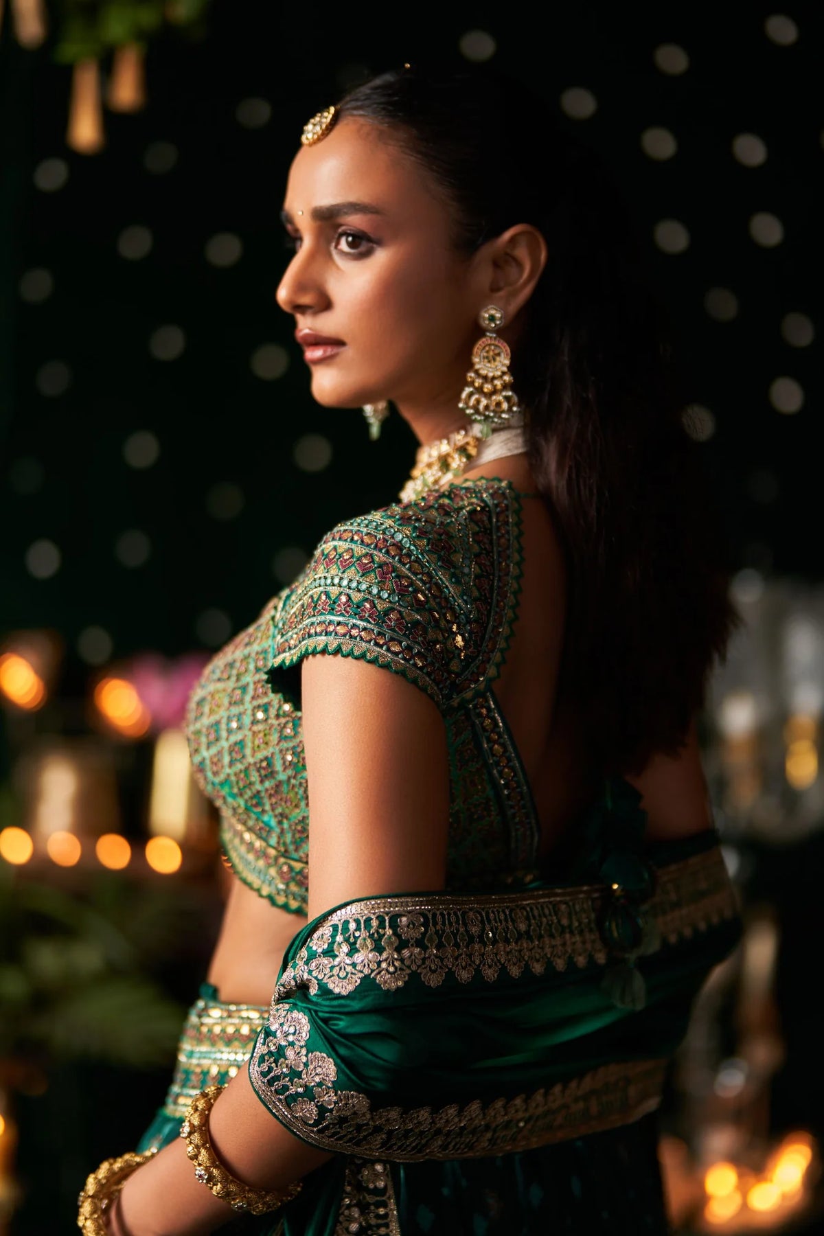 Blouse: Ikkat Fabric Lehenga: Organza Jacquard Butti Dupatta: Silk Fabric