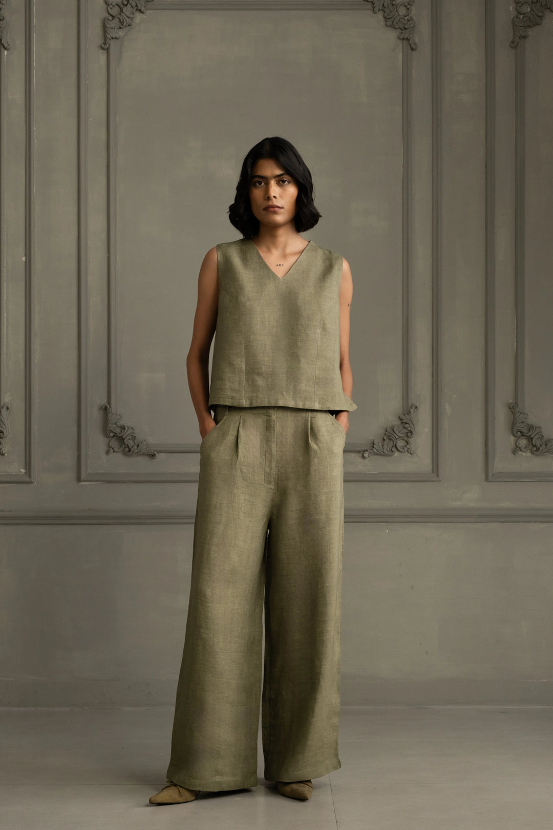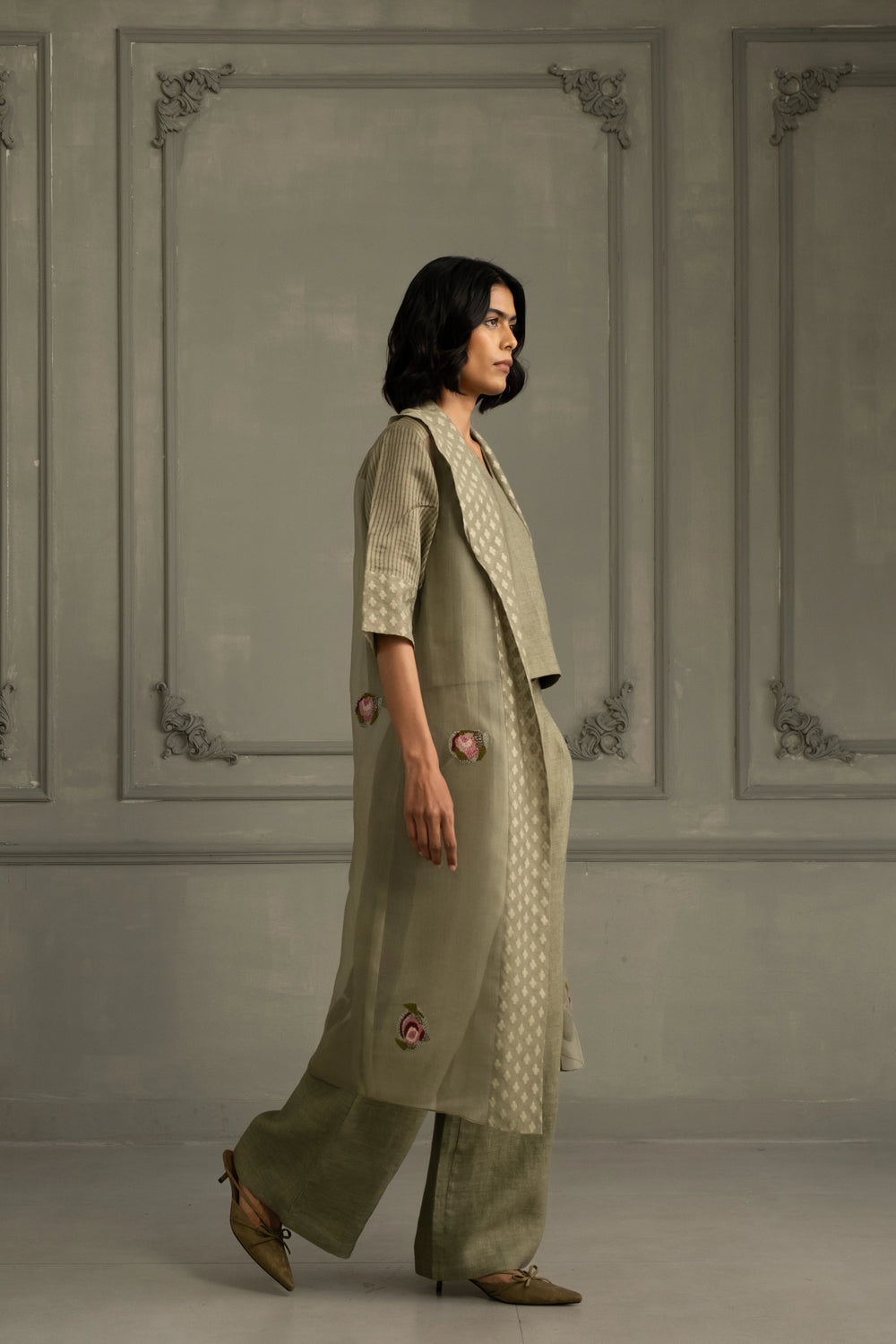 Sage Green Shirt in Silk Chanderi With Embroidery and Flared Pants in Linen