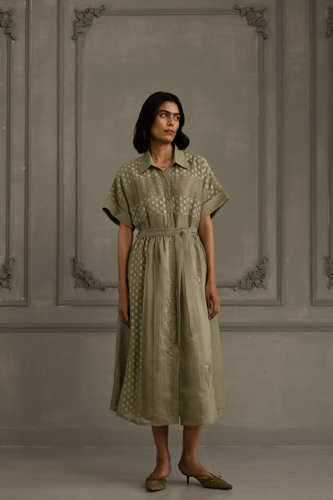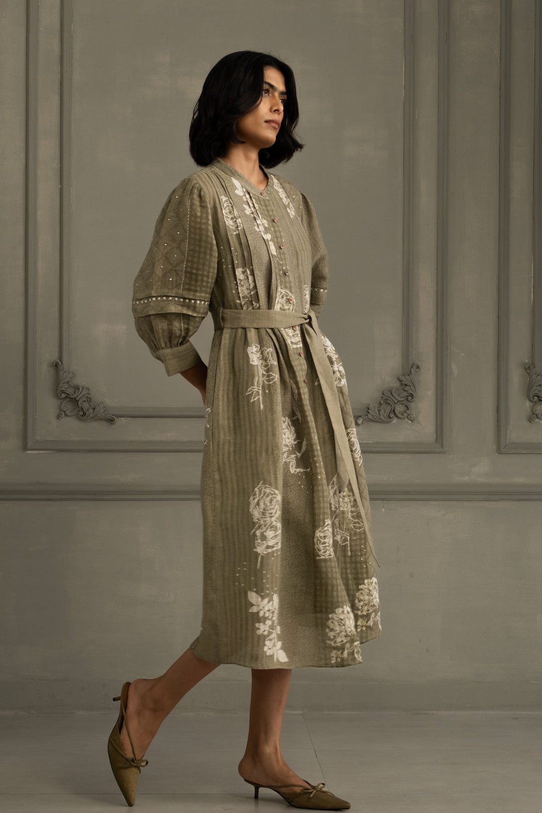 Sage Green Discharge Print Dress in Gauze Linen With Belt and Embroidery
