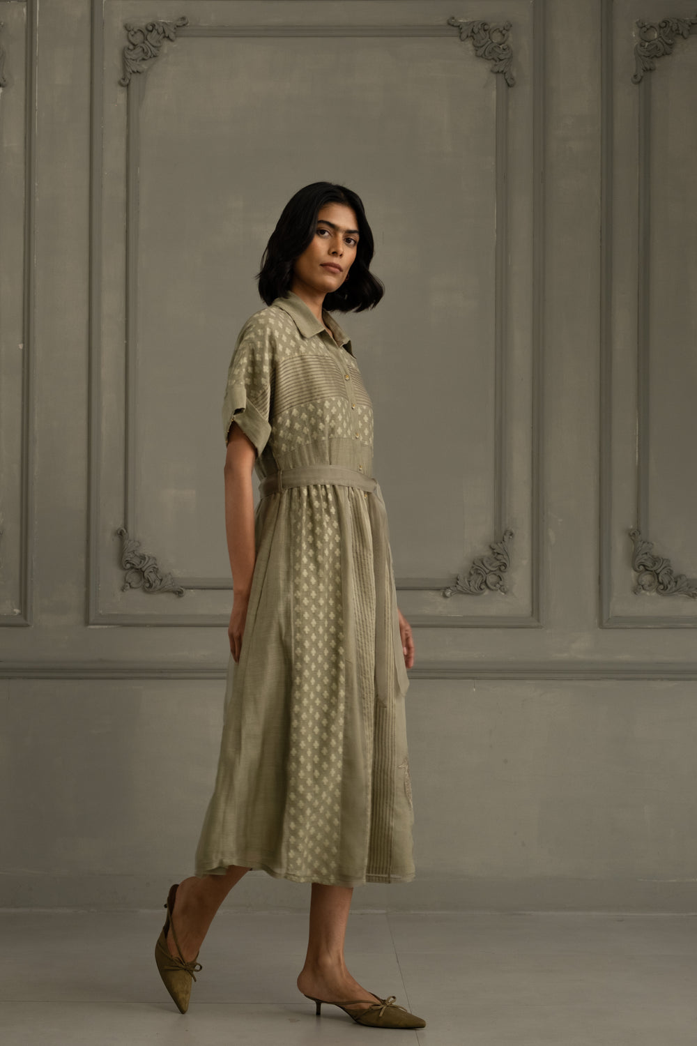 Sage Green Dress in Mul Chanderi With Belt and Hand Embroidery