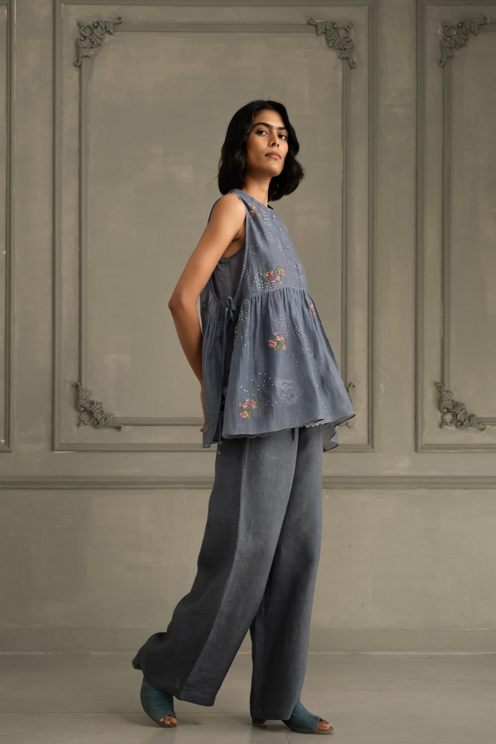Stone Blue Shirt in Mul Chanderi With Embroidery and Flared Pants in Linen
