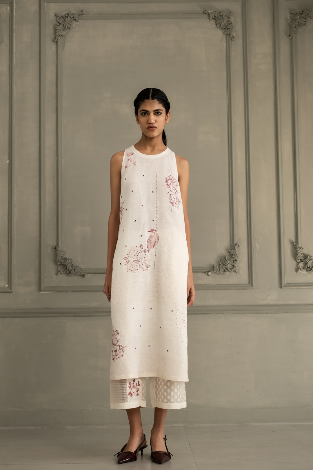 Ivory Block Print Linen Tunic With Embroidery and Linen Flared Pant