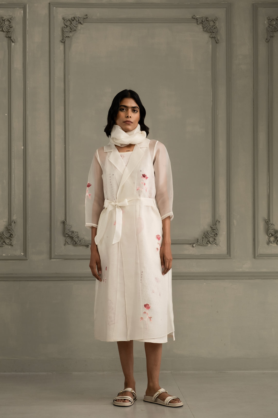 Ivory Rose Applique Work Organza Jacket With Block Print Linen Strap Dress