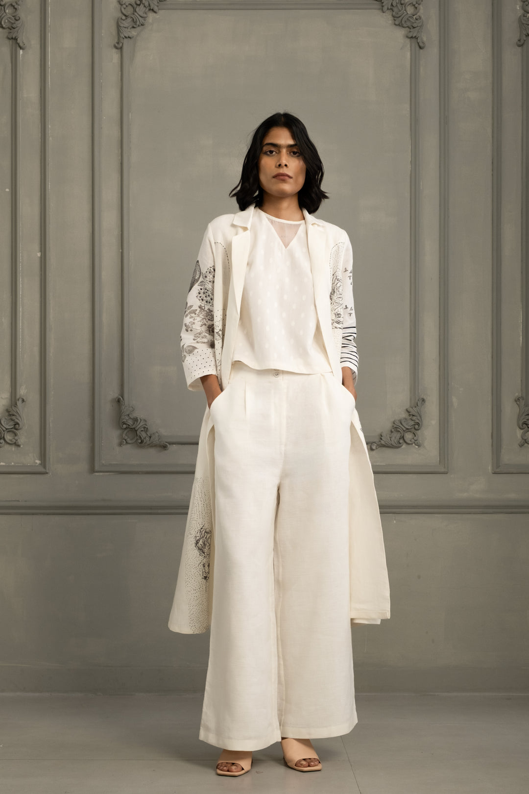 Ivory Embroidery and Block Print Jacket With Top and Flared Pant in Linen