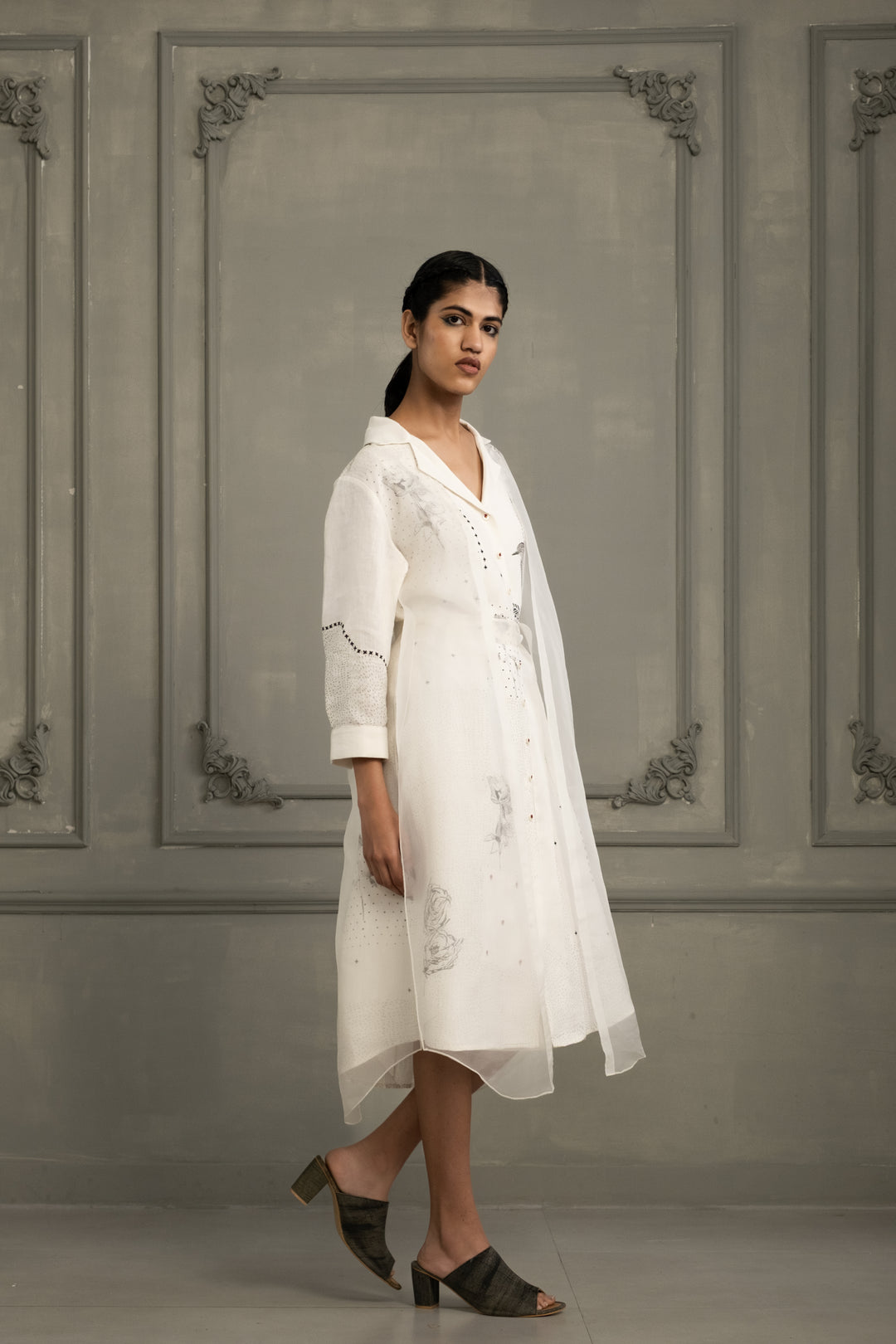 Ivory Double Layer Block Print Dress in Linen and Organza With Embroided Sleeves
