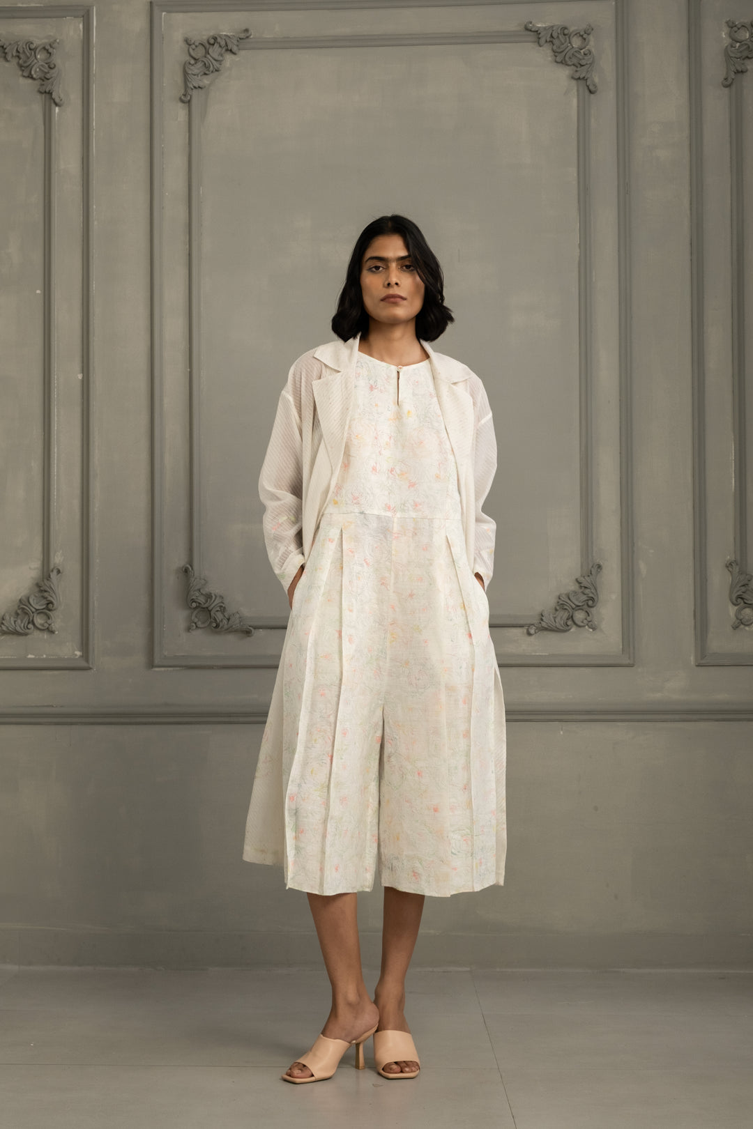 Ivory Quilting Mul Chanderi Jacket With Embroidery and Multiprint Jumpsuit in Linen