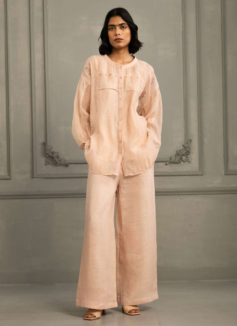 Old Rose Shirt in Mul Chanderi With Embroidery and Flared Pants in Linen
