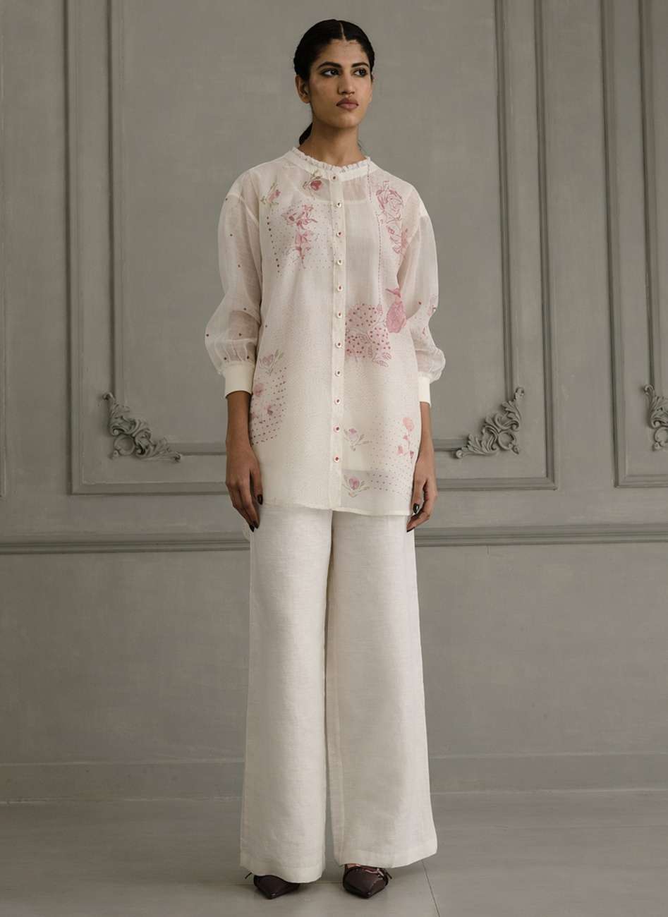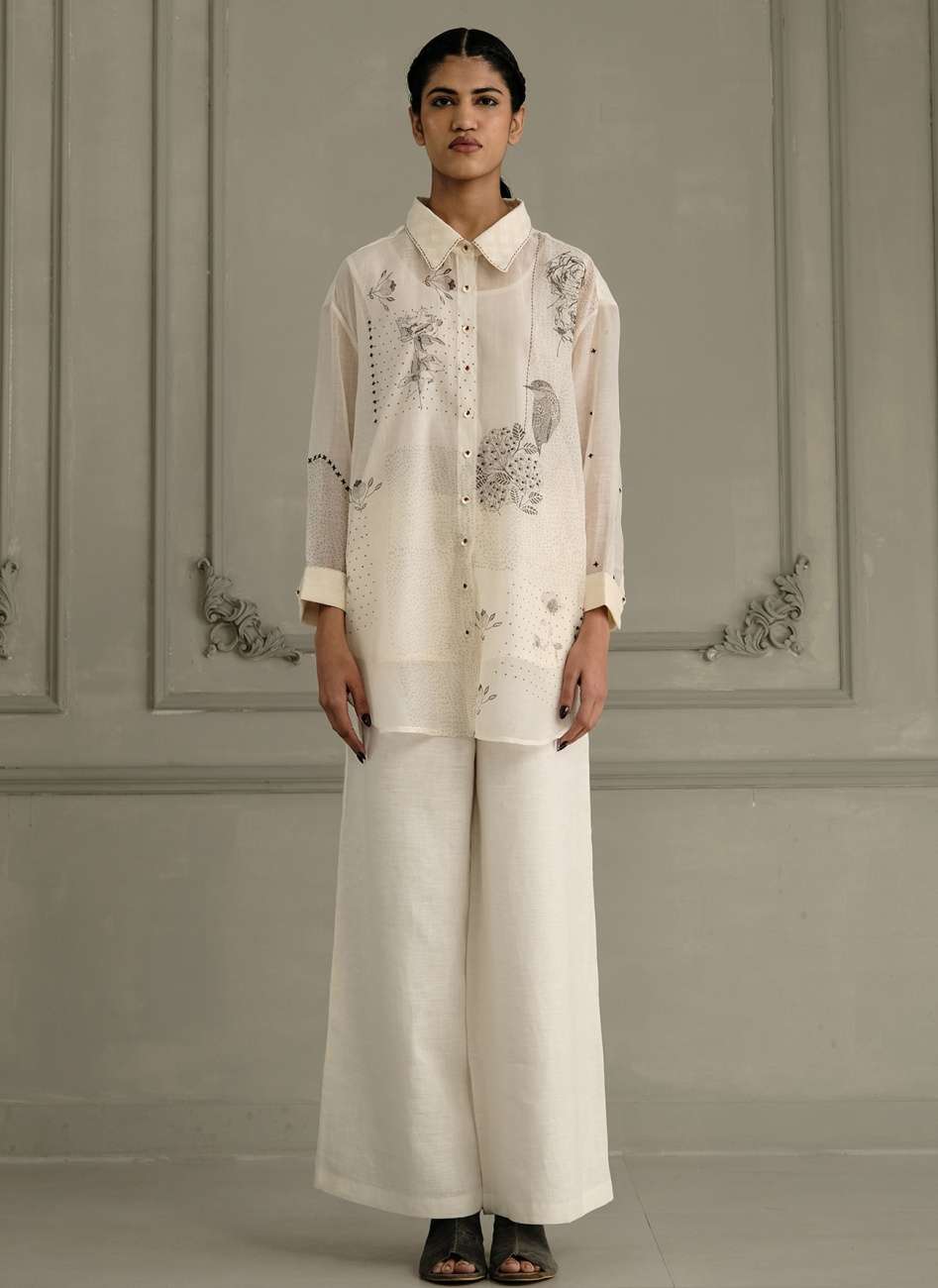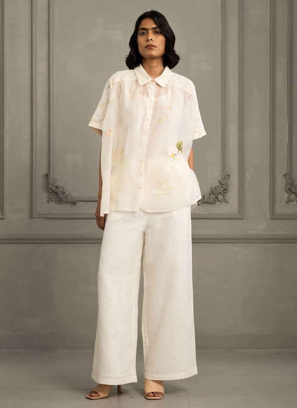 Ivory Shirt in Mul Chanderi With Embroidery and Flared Pants in Linen