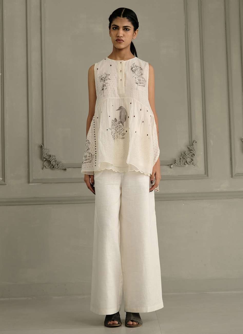 Ivory Top in Mul Chanderi With Embroidery and Flared Pants in Linen
