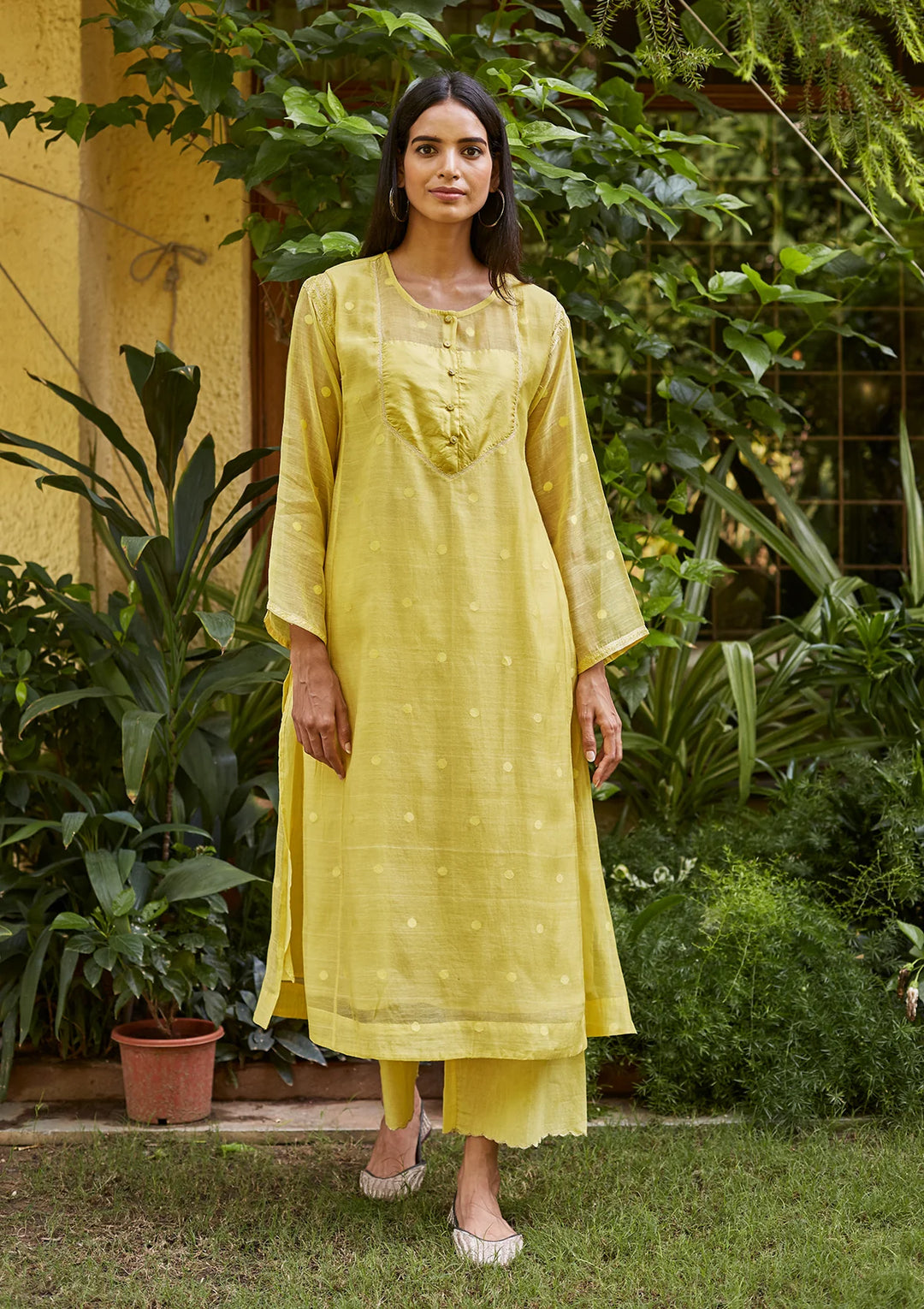 Lime mustard Tissue centre gathered A-line Kurta Set