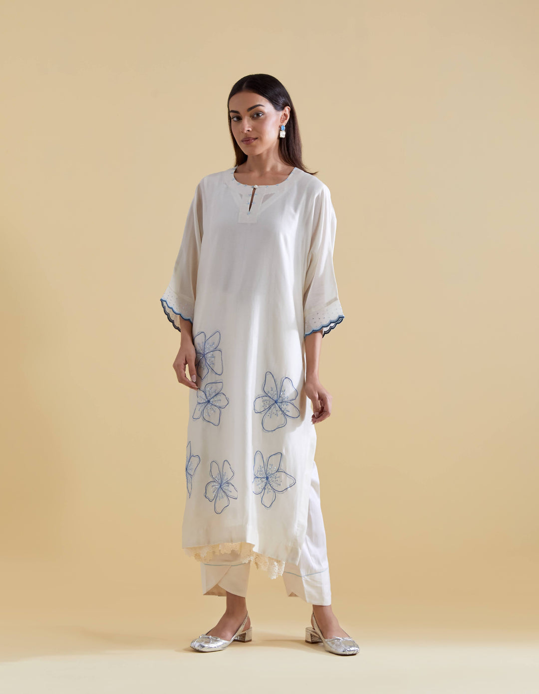 Ivory Kurta Set in Chanderi Floral Embroidery in Ivory and Blue