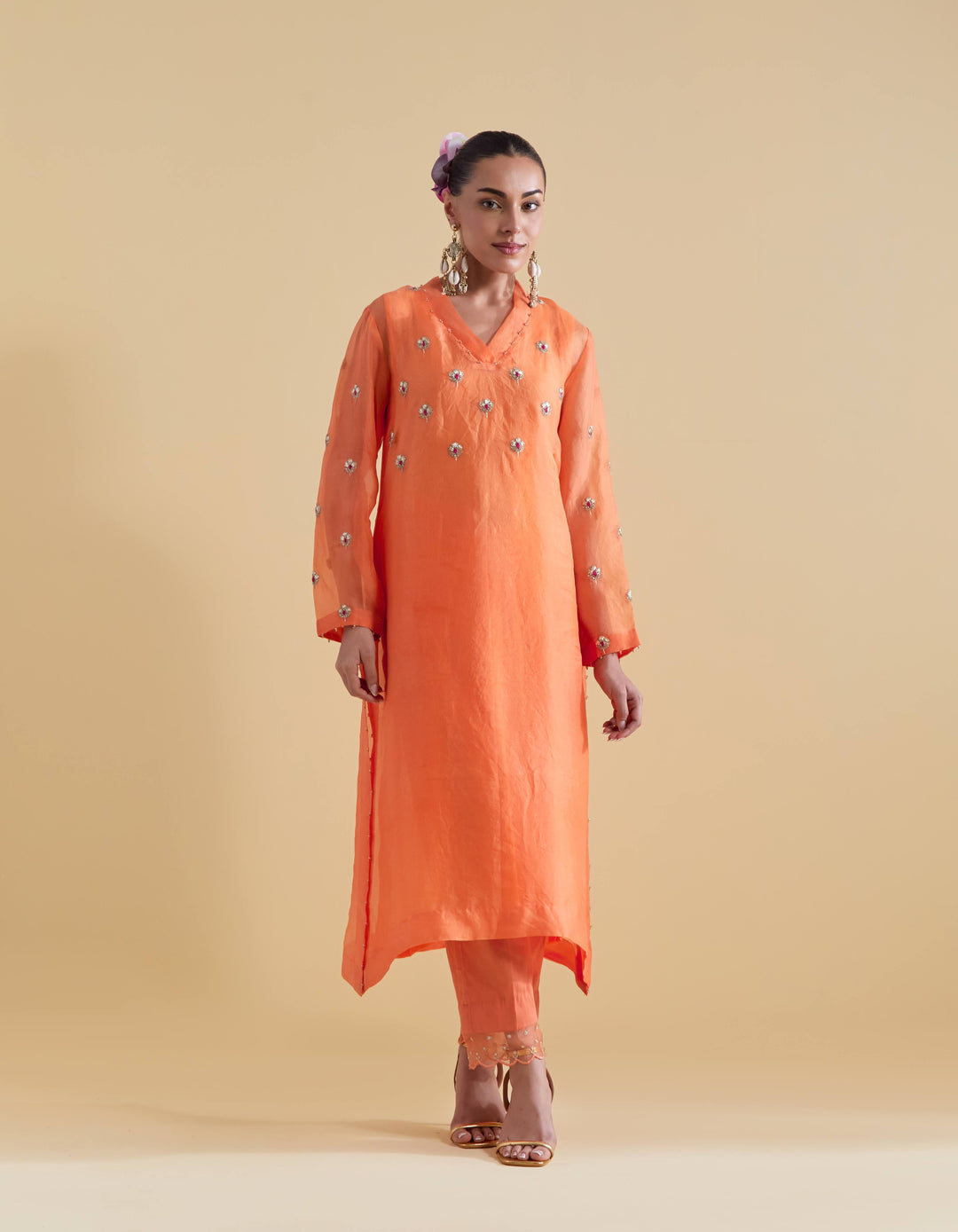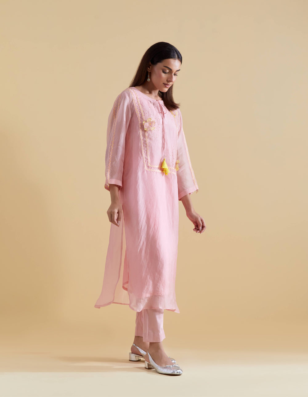 Appliquéd Organza Embroidery in Pink on Ivory Chanderi Kurta Set