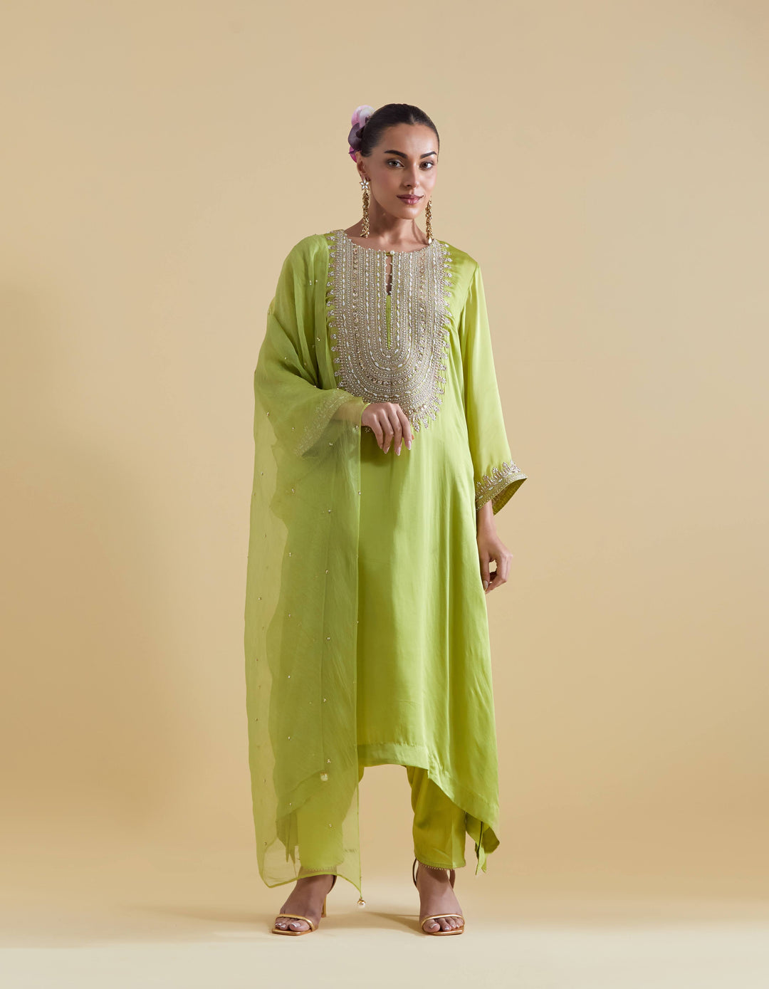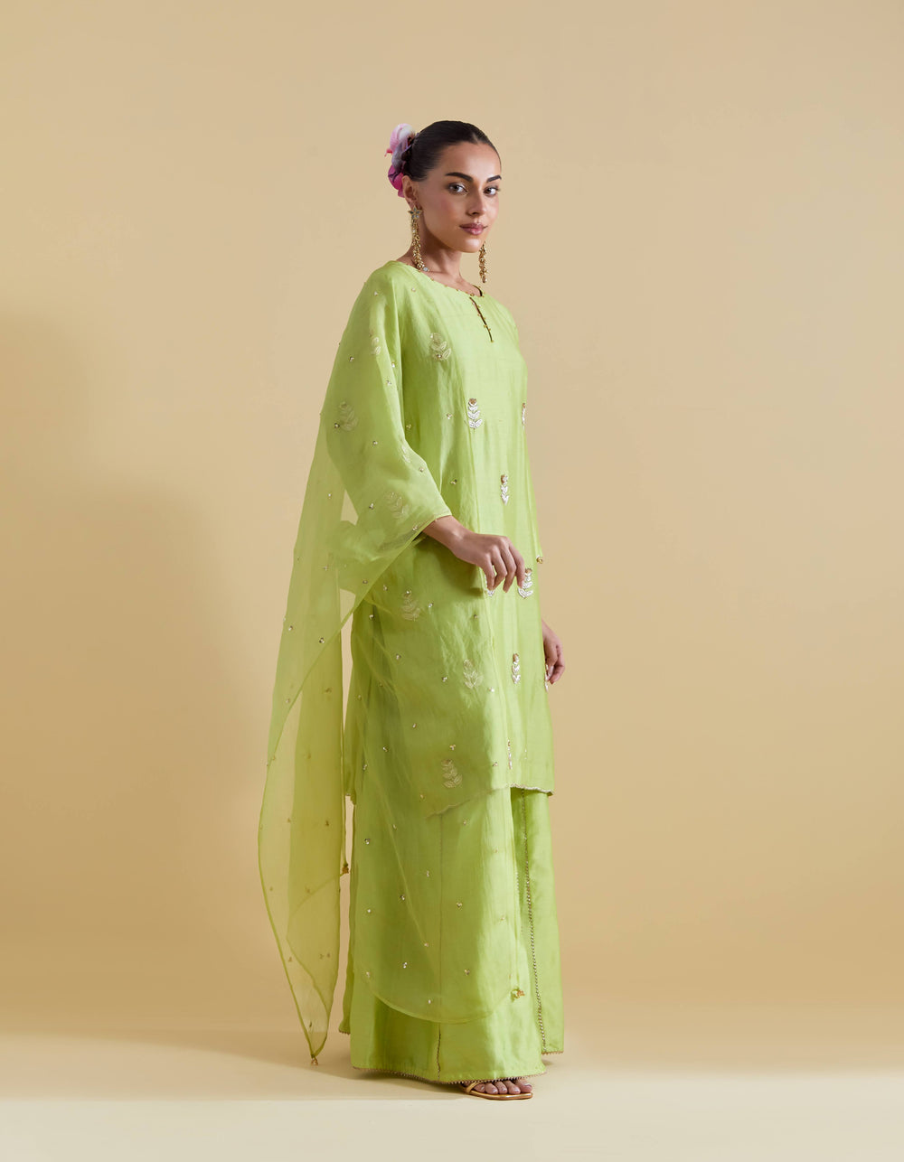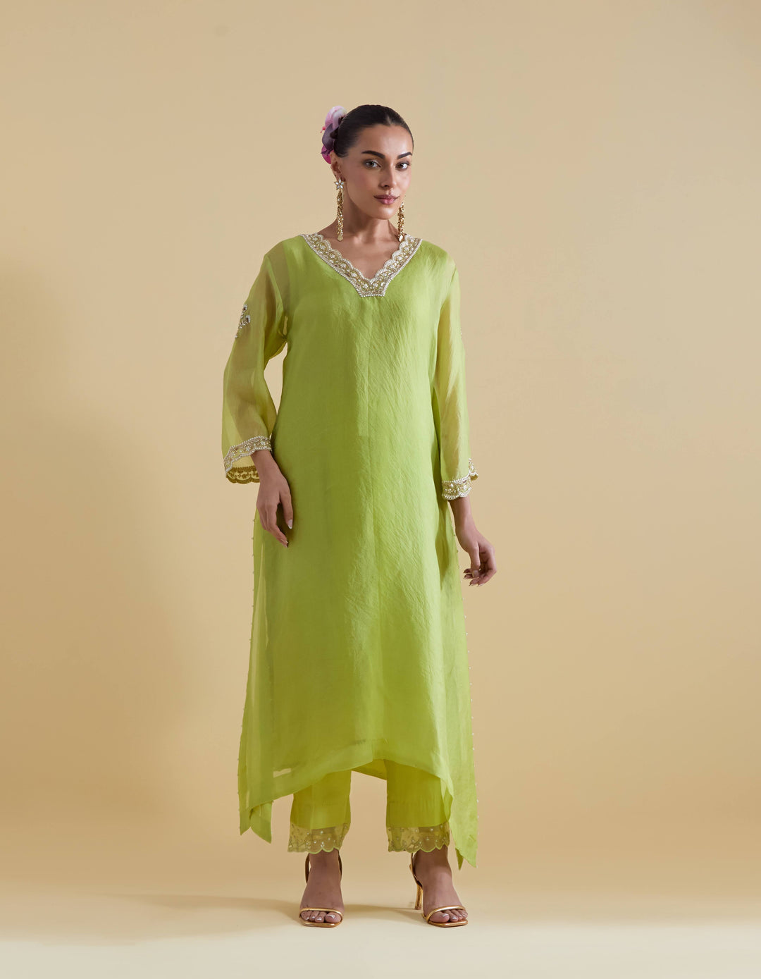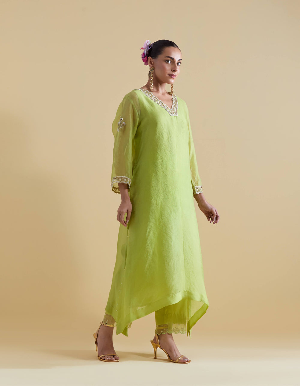 Appliquéd Organza Embroidery in Lime on Ivory Chanderi Kurta Set
