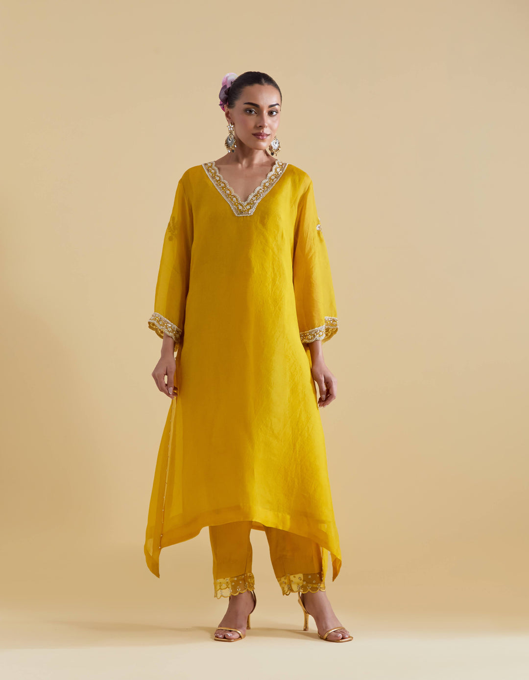 Mustard Scallopped V Neck Kurta Set with a Slip