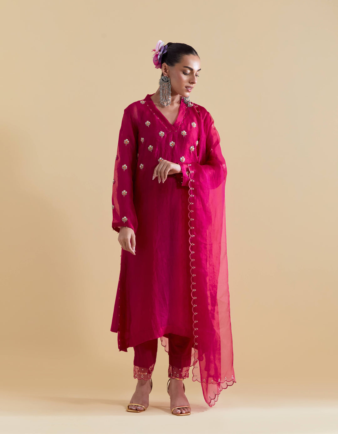 Rani Pink Scallopped V Neck Kurta Set with a Slip