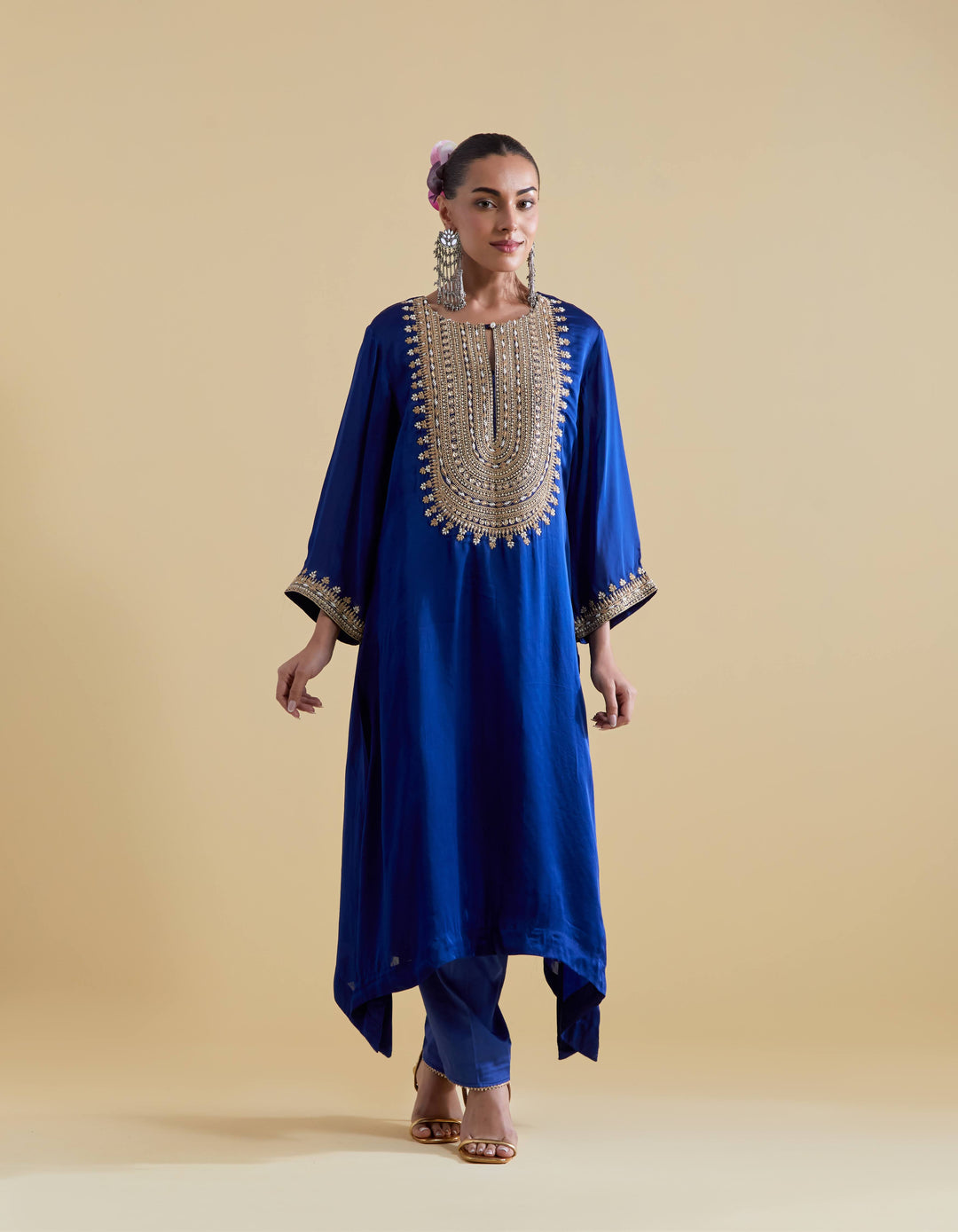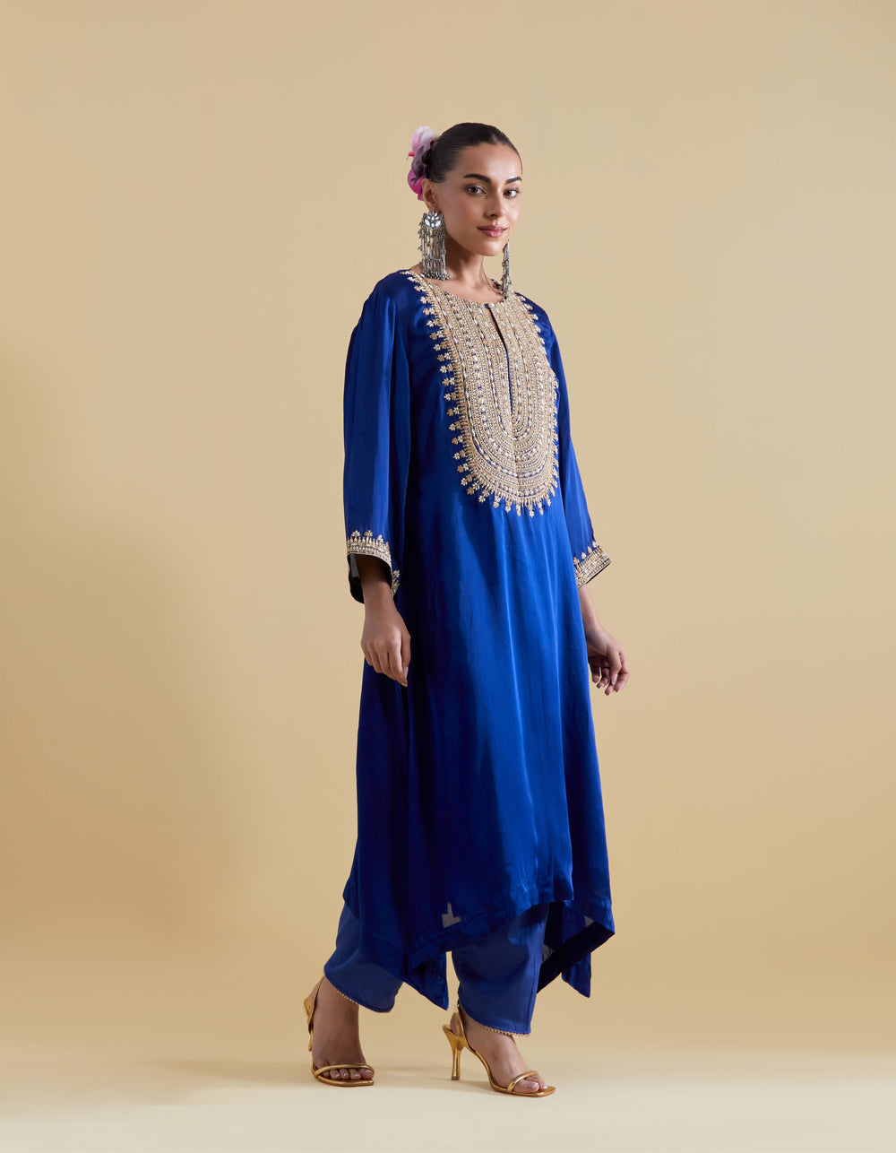 Royal Blue Scallopped V Neck Kurta Set with a Slip