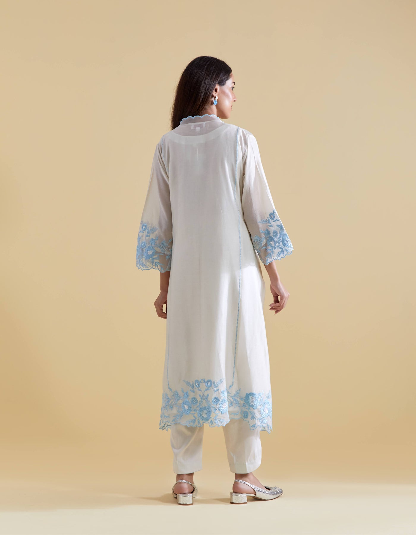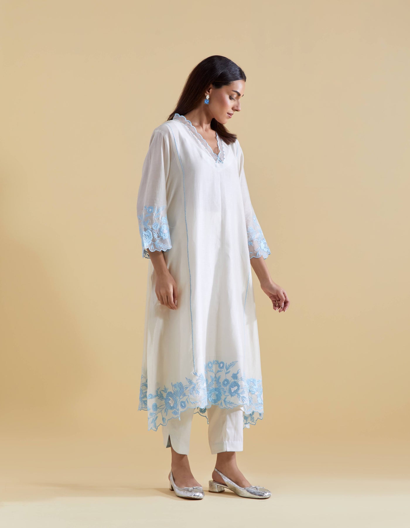 Ivory V Scallopped Neck Kurta Set with Floral Thread Embroidery in Blue