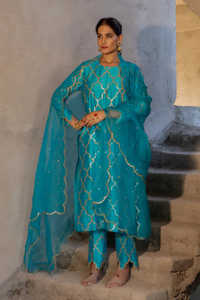 Firozi Gota Patti Jaal Work Straight Kurta Set
