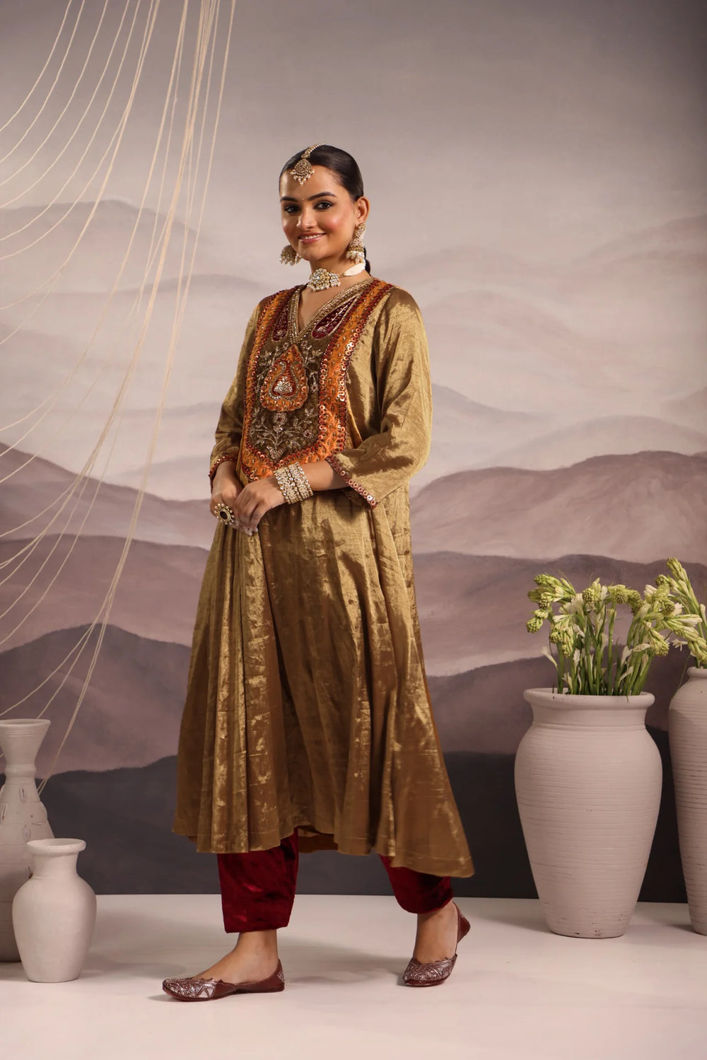 Gold Tissue Kalidar with Antique Look Yoke & Maroon Velvet Salwar
