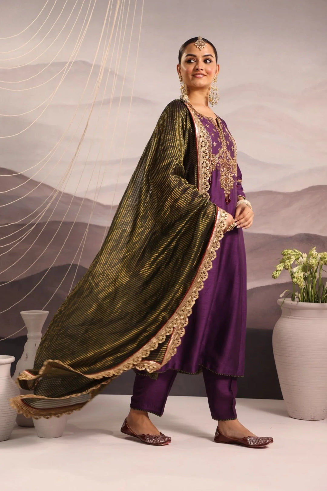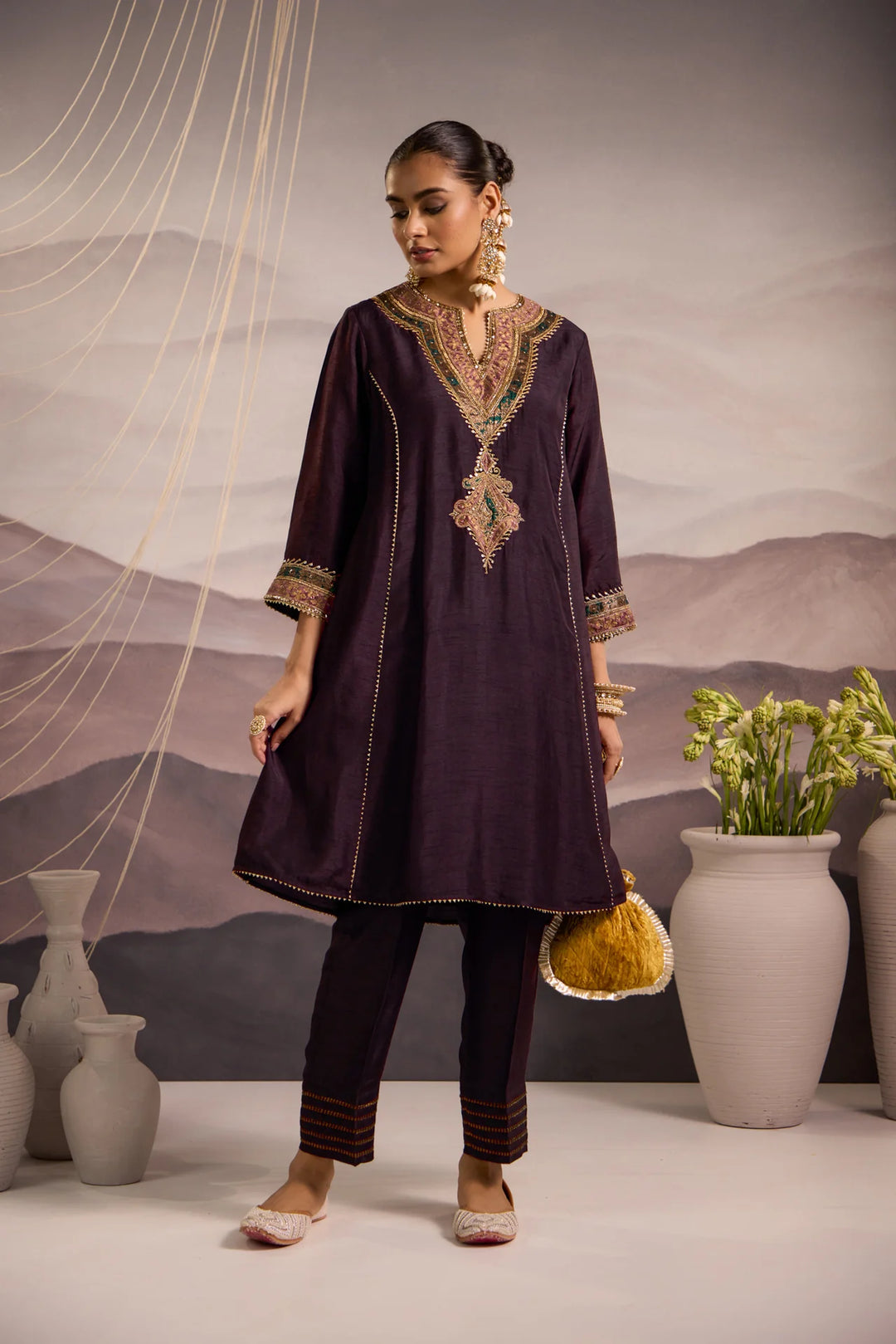 Purple Silk Kurta Set with Hand-Embroidered Yoke & Beaded Tassels