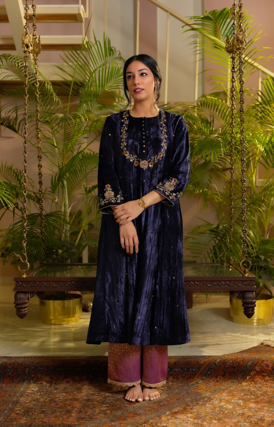 Royal Blue Velvet Hand Embroidered Gul Kurta Set