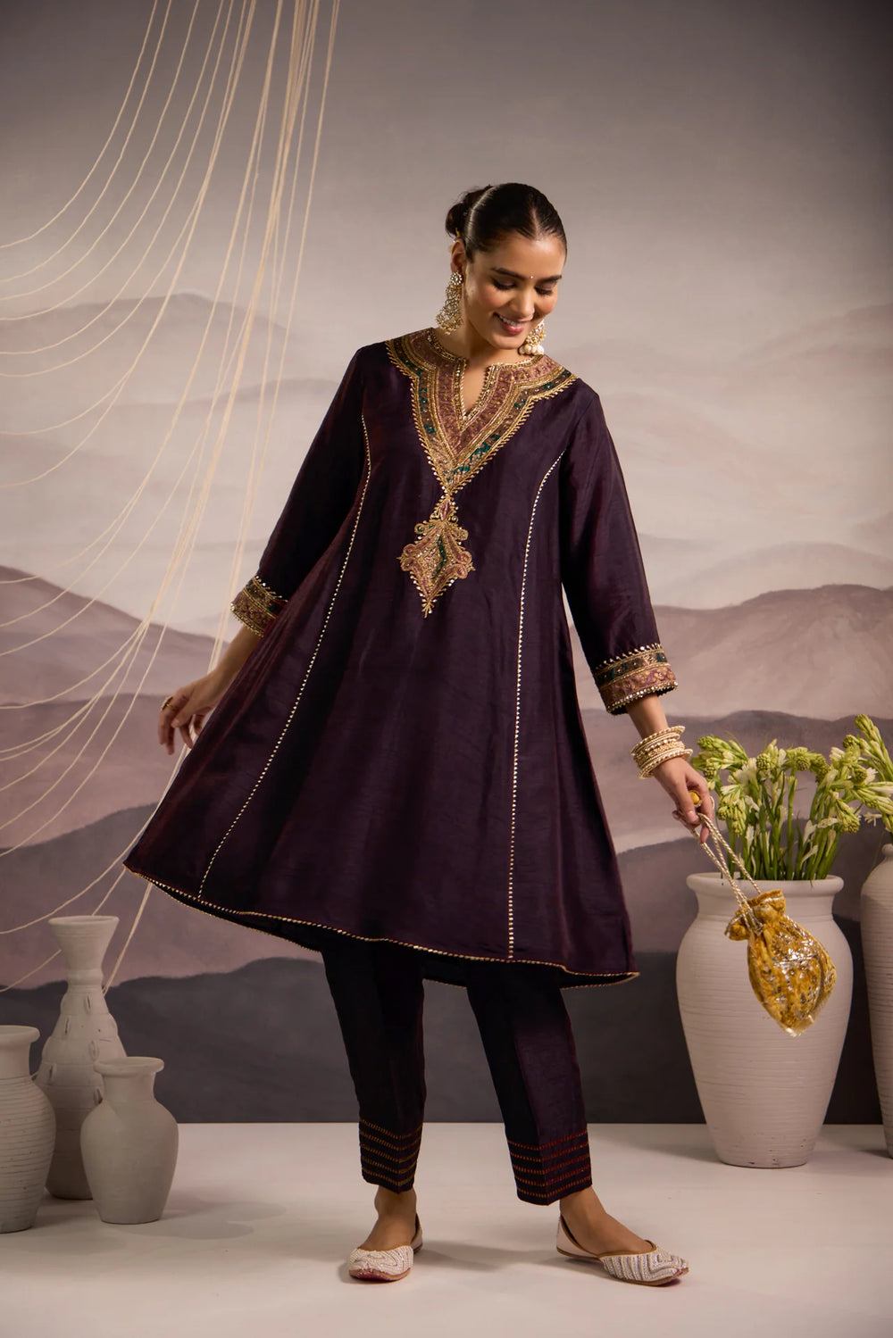 Wine Silk Choga Kurta Set with Hand-Embroidered Yoke & Lilac Dupatta
