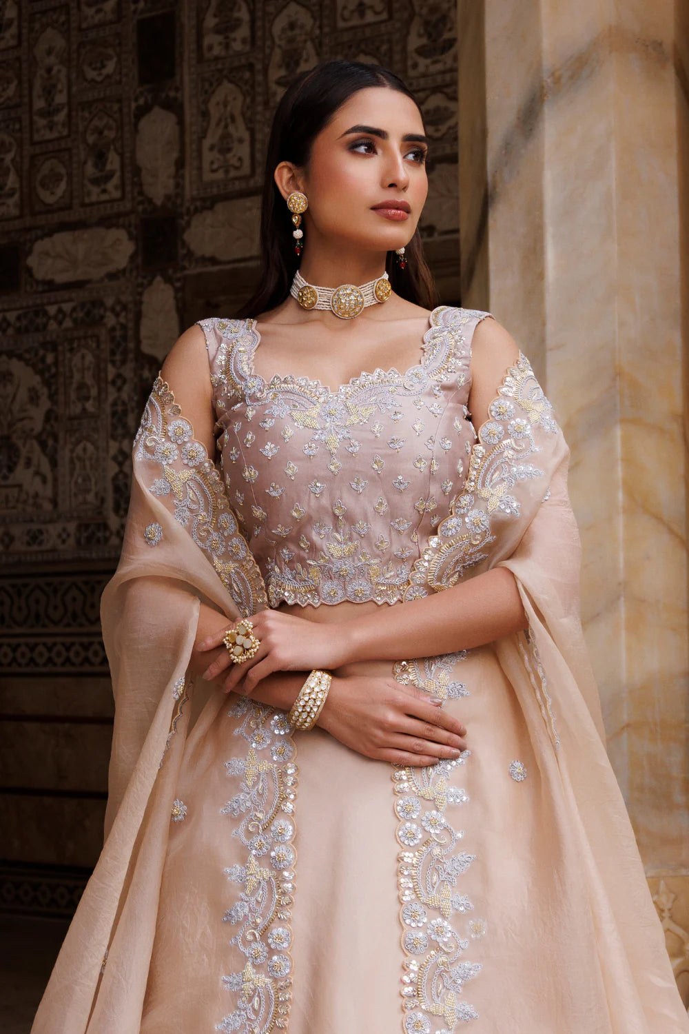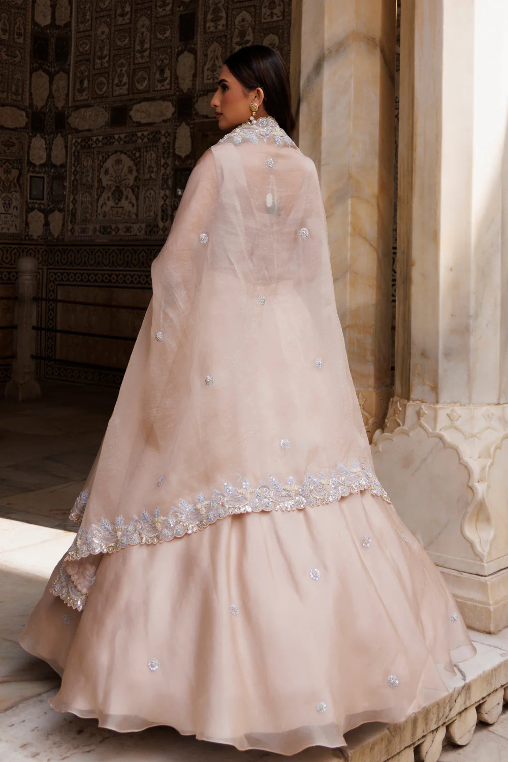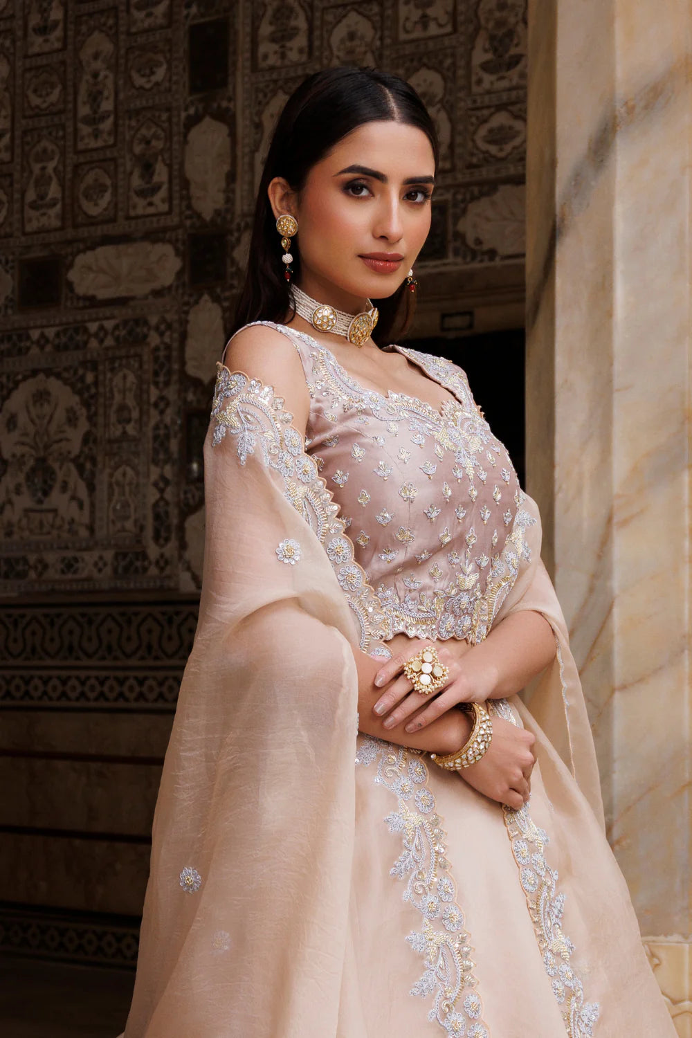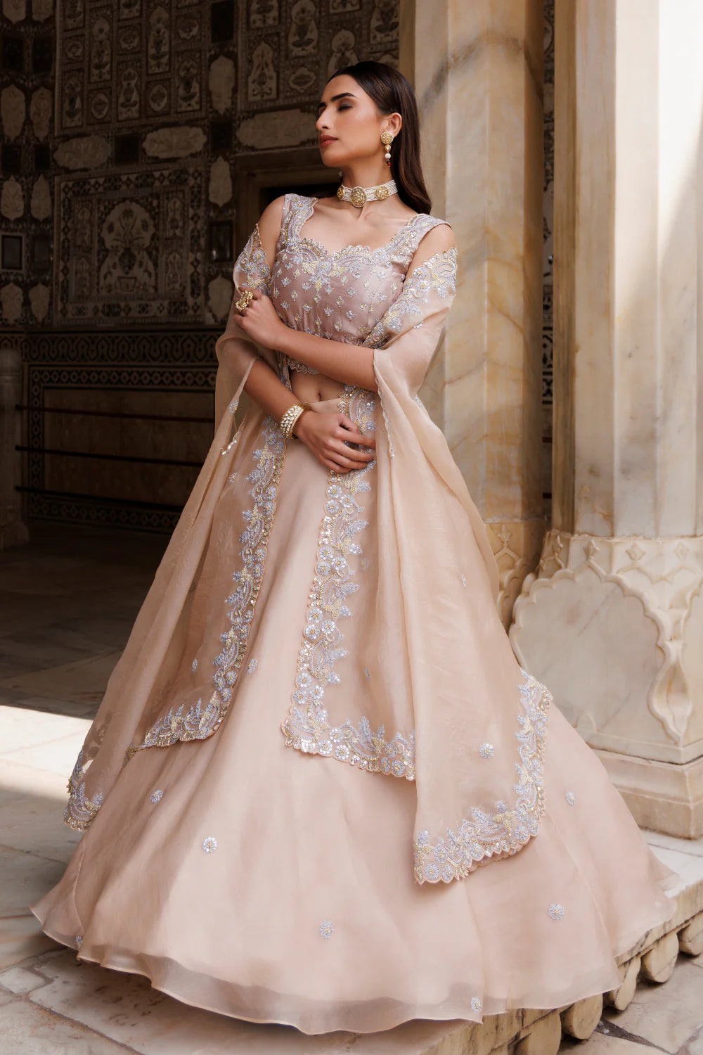 Cape and Lehenga: Pure Silk Organza. Blouse: Pure Silk