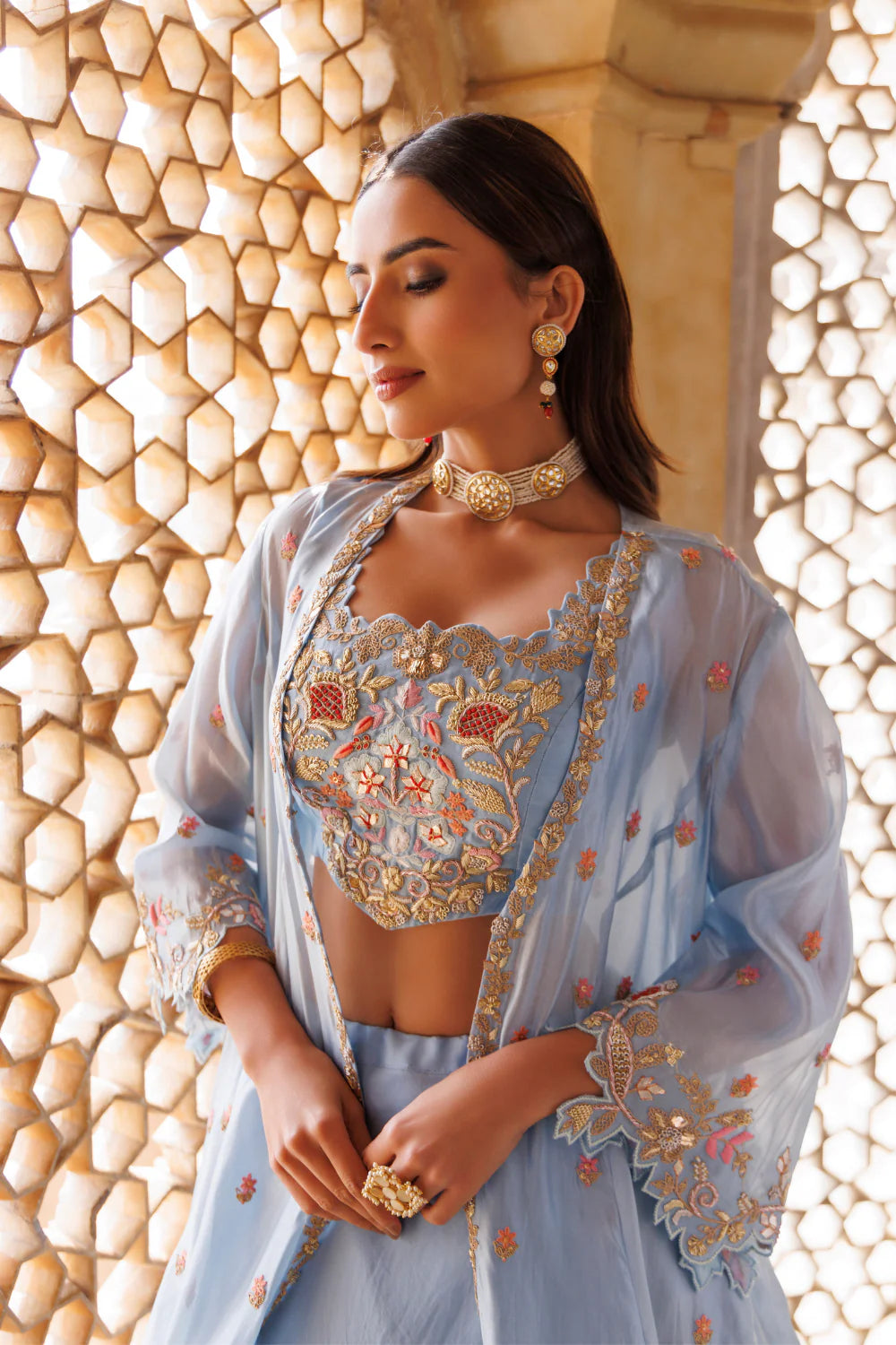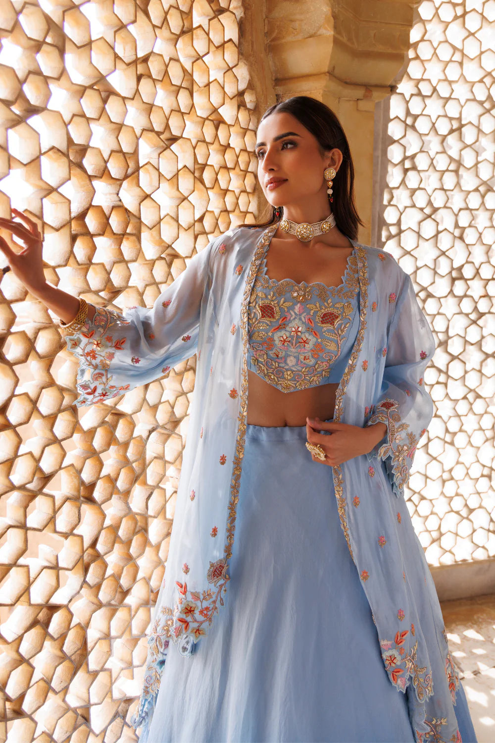 Embroidery/print: Dori Marodi, Tamba Gota Patti, Reshamwork, Zardozi and Sequins